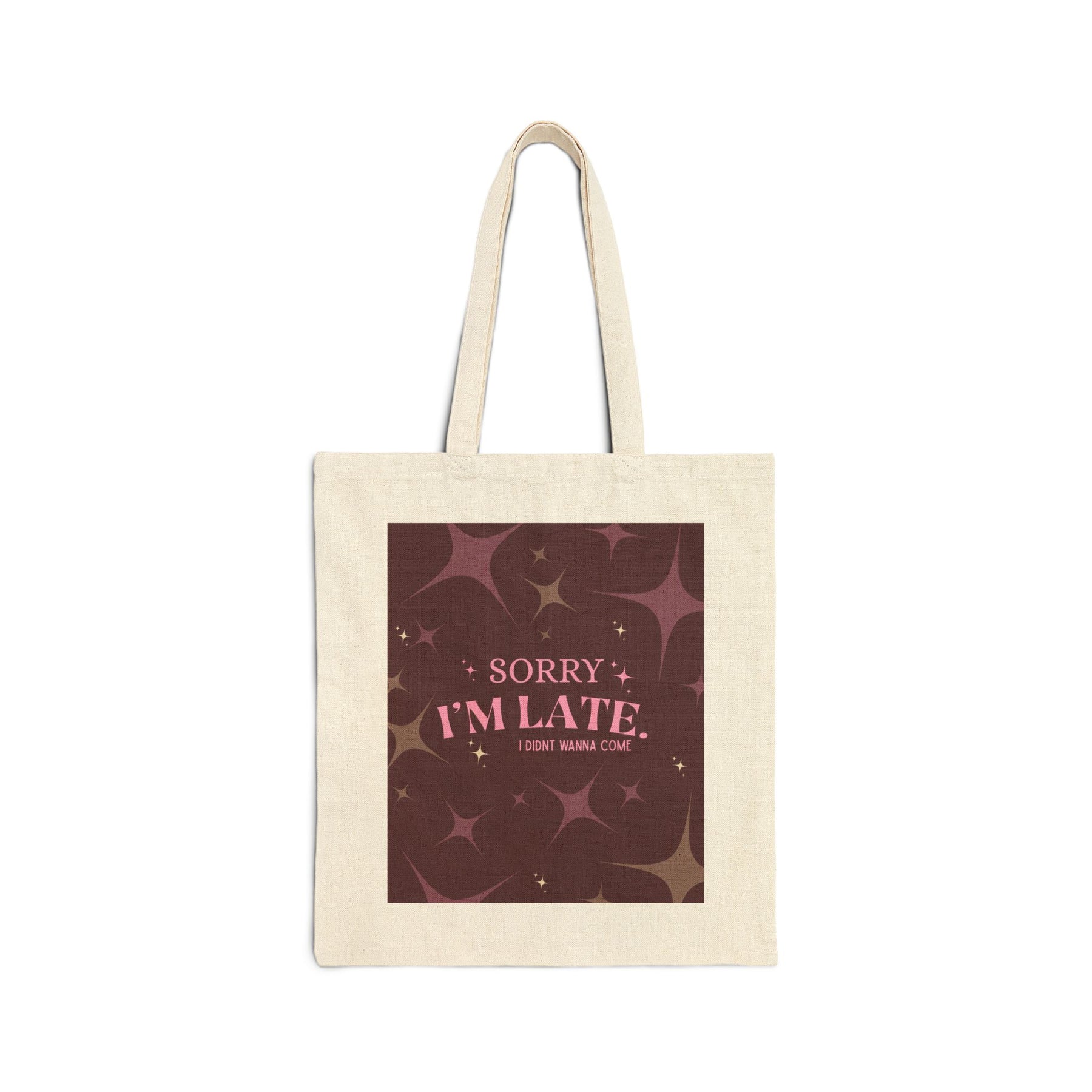 Bold purple and black lettering says what we’re all thinking: “sorry I’m late, I just didn’t want to come.” No cap. No excuses. Just vibes.